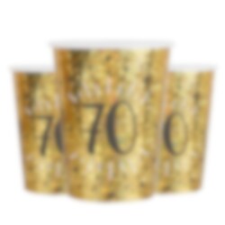 10 glänzende Pappbecher in Gold mit der Zahl 70. Diese eleganten Becher sind perfekt, um Getränke stilvoll zu servieren und verleihen der 70. Geburtstagsfeier einen festlichen Glanz. Sie sind ca. 10 cm hoch und fassen 270 ml.