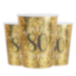 10 glänzende Pappbecher in Gold mit der Zahl 80. Diese eleganten Becher sind perfekt, um Getränke stilvoll zu servieren und verleihen der 80. Geburtstagsfeier einen festlichen Glanz. Sie sind ca. 10 cm hoch und fassen 270 ml.