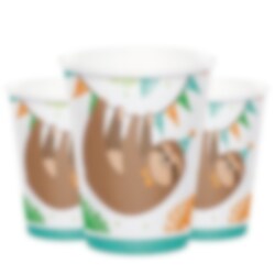 8 Pappbecher mit süßem Faultier-Motiv für die Party. Die Becher sind 10 cm hoch und fassen etwa 266 ml.