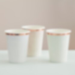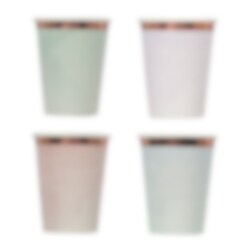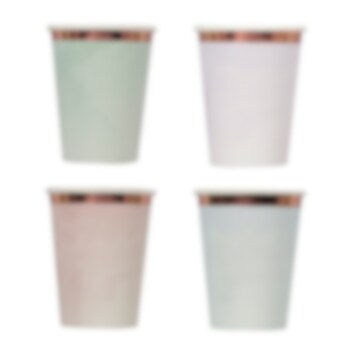 8 Pappbecher in 4 verschiedenen Pastellfarben mit Glanzeffekten und roségoldenen Rändern. Stellen Sie diese rechtzeitig vor der Party auf, um den Tisch besonders schön zu decken. Die Becher sind 10 cm hoch und fassen etwa 266 ml.