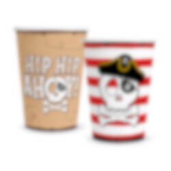 Feiern Sie einen actionreichen Piratengeburtstag mit diesen festlichen Pappbechern im klassischen Piraten-Design. Die Becher haben zwei verschiedene Motive: eines mit dem Text "Hip Hip Ahoy!" auf einem Hintergrund, der einer Schatzkarte ähnelt, und eines mit Totenkopf, Piratenhut und roten Streifen, was sie zu einer stilvollen und verspielten Dekoration auf dem Geburtstagstisch macht.