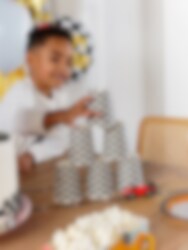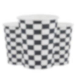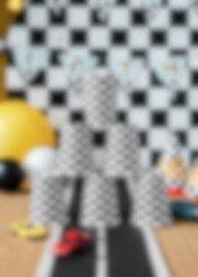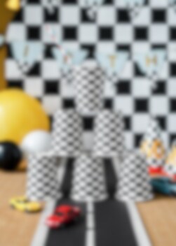 6 Becher im rasanten Rennwagenthema. Die Becher haben Motive der klassischen Zielflagge bei Wettbewerben und passen sehr gut zusammen mit anderem Zubehör für eine Kinderparty mit Autothema. Die Becher sind 9 cm hoch und fassen 220 ml.