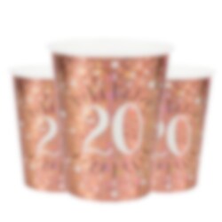 10 glitzernder Pappbecher in Roségold mit der Zahl "20". Diese Becher sind wirklich schön und dekorativ, wenn Sie für eine 20. Geburtstagsfeir decken. Die Becher sind etwa 10 cm hoch und fassen 270 ml.