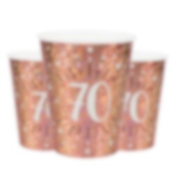 10 glitzernder Pappbecher in Roségold mit der Zahl "70". Diese Becher sind wirklich schön und dekorativ, wenn Sie für eine 70. Geburtstagsfeir decken. Die Becher sind etwa 10 cm hoch und fassen 270 ml.