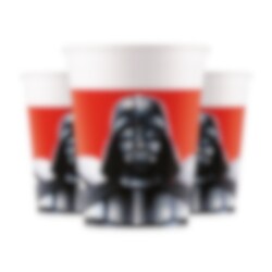 8 Pappbecher mit Motiven von Darth Vader und 2 Stormtroopern aus Star Wars vor rot-weißem Hintergrund. Decken Sie den Tisch für die Star Wars-Party zusammen mit weiterem passenden Partygeschirr. Die Becher sind 10 cm hoch und fassen etwa 200 ml.