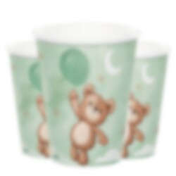 8 hellgrüne Pappbecher mit niedlichem Motiv eines Teddybären, der einen Luftballon hält. Die Becher sind 10 cm hoch und fassen 266 ml.