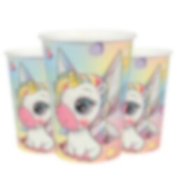 10 schöne Pappbecher in Pastellfarben mit einem süßen Einhornmotiv. Die Becher sind 10 cm hoch und fassen 270 ml.