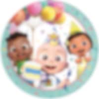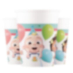 8 Pappbecher mit lustigen Motiven von Cocomelon-Figuren. Perfekt, wenn Sie eine lustige Tischdekoration für eine Party mit Cocomelon-Motto gestalten möchten.