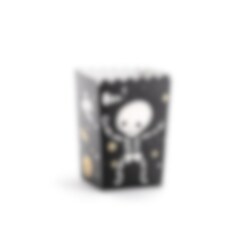 6 Popcornboxen mit dem Wort "BOO!". Sie sind 7 x 12,5 cm groß, was sie perfekt zum Servieren von Popcorn oder anderen Snacks an Halloween macht.