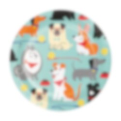 8 Kuchenteller mit Motiven verschiedener Hunde auf mintgrünem Hintergrund. Die Kuchenteller haben einen Durchmesser von etwa 18 cm.