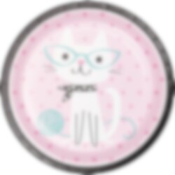 8 Pappteller mit rosa Hintergrund und schwarzen Rändern. Auf den Tellern ist außerdem eine hübsche Katze mit Brille abgebildet. Die Teller haben einen Durchmesser von etwa 22 cm.