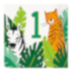 16 1. Geburtstag-Servietten in Weiß mit Motiven von niedlichen kleinen Safaritieren im Dschungel. Stilvoll auf den Tisch zu stellen, wenn es Zeit für eine Kinderparty ist. Passt perfekt zu unseren anderen Zubehör aus dem Safari-Motto.