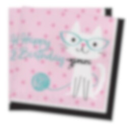 16 rosa und schwarze Servietten. Die Servietten haben auf einer Seite Motive einer Katze in Gläsern sowie den Text "Happy Birthday“. Die Servietten hat 2-lagen und ist 33 x 33 cm entfaltet.