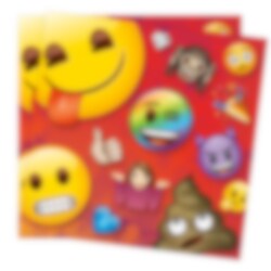 16 Servietten mit farbenfrohen und lustigen Motiven verschiedener Emojis auf rotem Hintergrund. Die Servietten haben 2 Lagen und sind entfaltet 33 x 33 cm groß.
