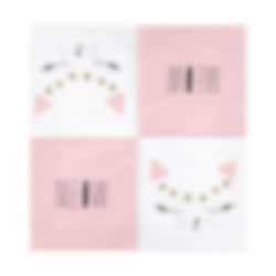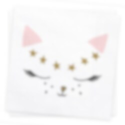 20 weiße Servietten mit dem Motiv einer Katze mit rosa Ohren auf der einen Seite und dem Text „Meow“ auf der anderen Seite. Decken Sie damit den Tisch, wenn es Zeit für eine Katzenparty ist. Die Servietten hat 3-lagen und ist 33 x 33 cm entfaltet.