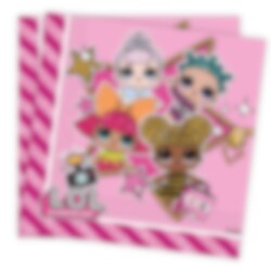 20 Servietten in Rosa Farben mit Motiven von Queen Bee, Glitter Queen, Cosmic Queen und Crystal Queen auf beiden Seiten aus der beliebten LOL Surprise-Puppenserie. Pefekt für Ihre LOL Surprise-Motto Kinderparty. Die Servietten hat 2-lagen und ist 33 x 33 cm entfaltet.