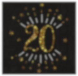 10 schwarze Servietten mit dekorativen Mustern und der Zahl 20 in Goldglitter. Diese Servietten eignen sich perfekt als Dekoration für eine 20. Geburtstagsfeier. Die Servietten haben 3 Lagen und fühlen sich luxuriös an. Größe 16,5 x 16,5 cm.