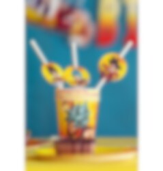 8 Papierstrohhalme mit lustigen Motiven aus der Serie Dragon Ball. Die Strohhalme sind etwa 19 cm lang und die Motive sind etwa 5 x 6 cm groß.