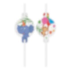 4 Papierstrohhalme mit Motiven von verschiedenen süßen Tieren. Die Strohhalme sind etwa 21 cm lang und die Motive haben einen Durchmesser von etwa 6,5 cm.