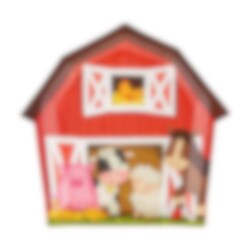 6 Pappteller im Bauernhof-Design, die die Tischdekoration für den Kindergeburtstag besonders lustig machen. Die Teller sind wie eine rote Scheune geformt und sind mit niedlichen Bauernhoftieren wie Schwein, Kuh, Schaf und Pferd verziert, was sie zu einem verspielten Detail auf dem Geburtstagstisch macht.