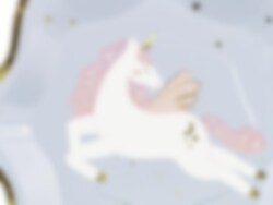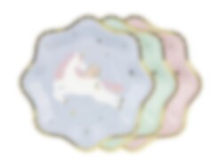 Gestalte eine magische Tischdekoration mit diesen wunderschönen Einhorn-Tellern! Jeder Teller ist mit einem bezaubernden Einhorn verziert, das zwischen Sternen und Wolken galoppiert, umgeben von einem eleganten, gewellten Rand mit goldfolierten Details. Die sanften Pastellfarben in Blau, Rosa und Mintgrün machen sie zur perfekten Ergänzung für Geburtstagsfeiern, Prinzessinnenpartys oder andere märchenhafte Anlässe.