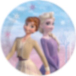 8 Pappteller mit einem wunderschönen Motiv von Anna und Elsa vor einem schönen Hintergrund in tollen Farben aus dem Film Frozen – Die Eiskönigin 2. Decken Sie damit den Tisch, wenn Sie eine lustige Frozen-inspirierte Party veranstalten möchten.