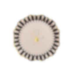Elegante Pappteller für eine stilvolle Halloween-Tafel. Die dezente Hintergrundfarbe lässt die glänzende Goldspinne in der Mitte hervorstechen, der geschwungene Rand zeigt schwarze Streifen und schließt mit goldfoliertem Abschluss für einen edlen Look.