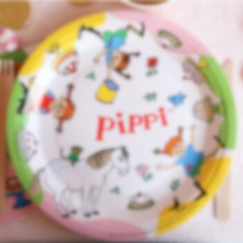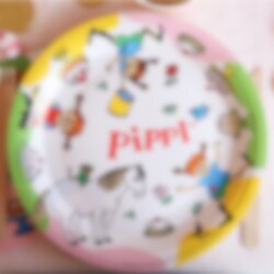 8 bunte Pappteller mit lustigen Motiven von Pippi und ihren Freunden aus Astrid Lindgrens Büchern über Pippi Langstrumpf. Diese Teller sind 23 cm im Durchmesser.