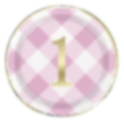 8 Pappteller mit rosa-weißem Karomuster, vergoldeten Rändern und einer goldenen 1 in der Mitte. Ein stilvolles Accessoire für die 1. Geburtstagsparty. Die Teller haben einen Durchmesser von etwa 23 cm.
