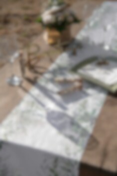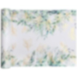 Wunderschöner Tischläufer mit raffinierten Motiven aus grünem Blattwerk und Reliefdetails mit Goldfolie. Decken Sie den Tisch schön mit diesem für eine feinere Veranstaltung oder Sommerfest.