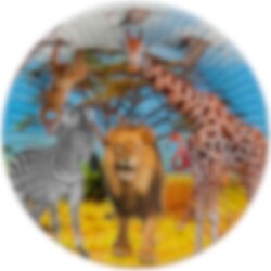 8 Teller mit Motiven cooler Regenwald- und Savannentiere. Die Teller haben einen Durchmesser von etwa 23 cm.