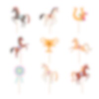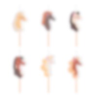 Mit diesen liebevollen Cake Toppers im Pferde-Look wird jede Torte oder jedes Muffin zum Hingucker. Das Set enthält galoppierende Pferde, Hufeisen, Rosetten und Pokale – perfekt für ein festliches Dessertbuffet mit Stallthema. Die Dekorationen sind ca. 11 cm hoch und bestehen aus Holz und Papier.