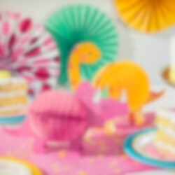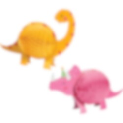 2 Tischdekorationen aus Wabenpapier, die einen Triceratops und einen Brontosaurus in den Farben Rosa und Gelb darstellen. Schöne Dekorationen zum Thema Dinosaurier für den Tisch auf der Kinderparty.