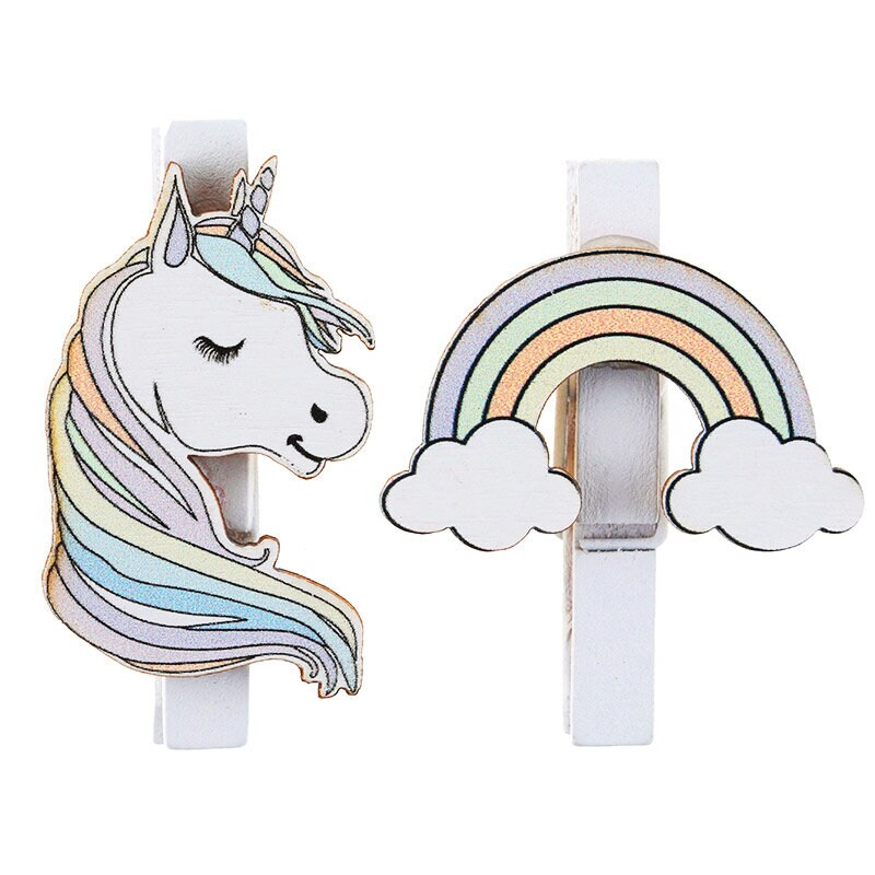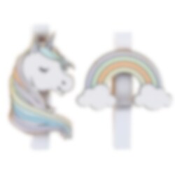 6 weiße Klammern mit Motiven von bunten Einhörnern und Regenbögen. Stilvolle zur Dekoration auf deiner Party oder in deinem Zimmer. Die Klammern sind aus Holz, 4 x 5 cm groß und du bekommst 3 Einhörner und 3 Regenbögen.
