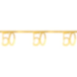 Dekorative Pappgirlande in glänzender Goldfolie und der Zahl 50. Die Girlande ist eine hervorragende Dekoration für Ihre 50. Geburtstagsfeier und jede Zahl ist 18 x 23 cm groß und die Girlande selbst ist 250 cm lang.