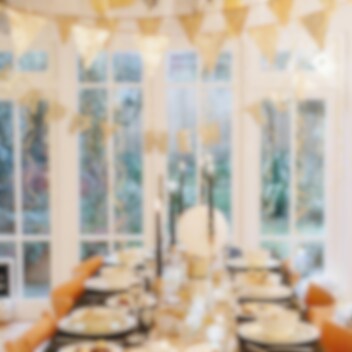 Kreieren Sie eine Atmosphäre von Festlichkeit und Glamour mit dieser luxuriösen, goldglitzernden Girlande. Mit einer Länge von 3 Metern verleiht sie jeder Veranstaltung einen Hauch von Eleganz. Jeder Wimpel ist 16 cm hoch.