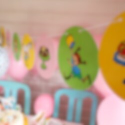 Bunte Girlande mit Motiven von Pippi und ihren lieben Freunden aus Pippi Langstrumpf. Eine beeindruckende Hängedeko für deine Pippi-Kinderparty zum Aufhängen. Die Girlande ist aus Pappe hergestellt und ist etwa 300 cm lang und die Motive sind etwa 16 cm groß.