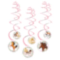 Hängende Dekorationen in rosa und weiß mit Pferden zwischen bunten Blumen. Dekorieren Sie damit den Partyraum für die Pferde-Mottoparty.