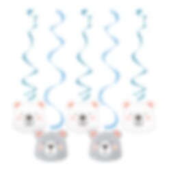5 hängende Dekorationen in Blautönen mit Motiven aus grauen und weißen Bären. Eine schöne Dekoration für die Party mit Bären-Motto. 2 der Dekorationen sind etwa 99 cm lang und 3 der Dekorationen sind etwa 76 cm lang.