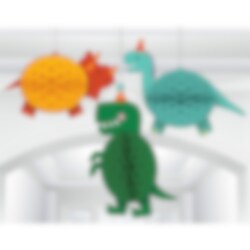 3 hängende Dekorationen in Wabenform, die Dinosaurier in verschiedenen Farben darstellen. Geeignet zum Aufhängen auf der Dinosaurierparty. Die Dekorationen sind etwa 16, 28 und 23 cm groß.
