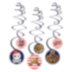 Hängende Dekorationen mit coolen Motiven verschiedener Piraten-bezogener Details. Perfekt, um den Raum damit zu dekorieren, wenn eine Piratenparty ansteht. Das Paket enthält