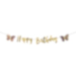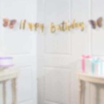 Superfeine Girlande mit Motiven von Schmetterlingen und dem Text Happy Birthday in Pastellfarben und Goldfolie. Die Girlande ist 2,13 Meter lang und die Motive sind 21 cm hoch.
