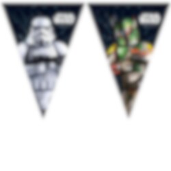 Wimpelkette aus Papier mit coolen Motiven von Stormtroopers und Boba Fett aus Star Wars. Eine schöne Dekoration, mit der Sie den Raum vor der Kinderparty mit einem lustigen Star Wars-Thema dekorieren können.