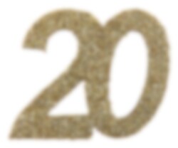 6 glitzerndes großes goldenes Konfetti zum Dekorieren auf der 20. Geburtstagsfeier. Das Konfetti ist in Form von der Zahl 20 und ist 6 x 6 cm groß. Sie sind aus Pappe hergestellt.