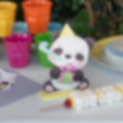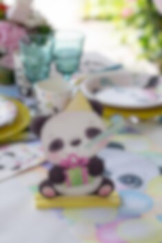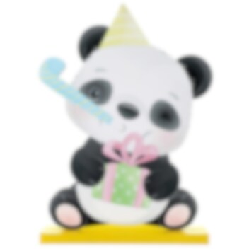 Supersüße Tischdekoration aus Holz mit dem Motiv eines Pandas, der auf einer Party ist. Die Dekoration besteht aus Holz und ist 14 x 20 cm groß.