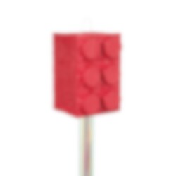 Schöne Piñata in Form eines roten Bausteins – ein lustiges Highlight für die Party! Die Piñata hat Bänder, die unten hängen, und die Kinder ziehen an den Bändern, um sie zu öffnen. Eines der Bänder öffnet die Piñata und lässt den Inhalt herausfallen.