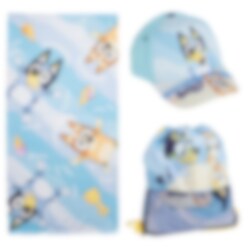 Ein perfektes Set für alle Bluey-Fans – bereit für sommerliche Abenteuer! Dieses Set enthält ein weiches, saugfähiges Handtuch für nach dem Baden, eine stylische Kappe zum Sonnenschutz und einen praktischen Turnbeutel mit Platz für alles, was man für einen Tag voller Spiel und Spaß braucht.