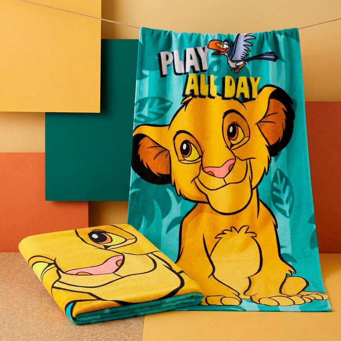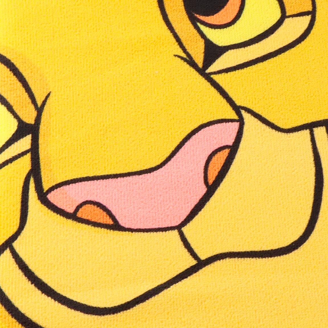 Mit diesem farbenfrohen Badetuch begleiten Sie die Abenteuer aus Der König der Löwen an den Strand. Das Motiv zeigt einen fröhlichen Simba bereit für Streiche, während sein Freund Zazu darüber gegen einen türkisfarbenen Hintergrund mit Dschungelblättern fliegt.