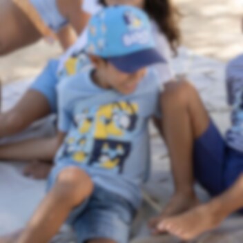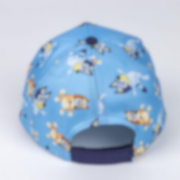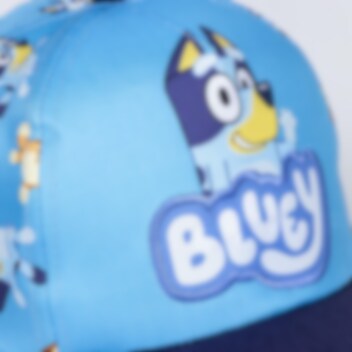 Schöne Kinderkappe in Blautönen mit dem süßen Hund Bluey darauf. Die Mütze ist aus 100 % Polyester gefertigt. Die Kappe hat einen Umfang von 53 cm und ist hinten verstellbar, wodurch sie in der Regel Kindern im Alter von ca. 4 bis 6 Jahren passt.