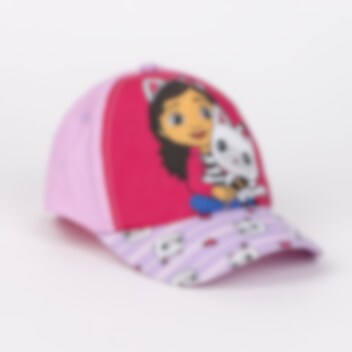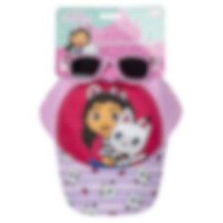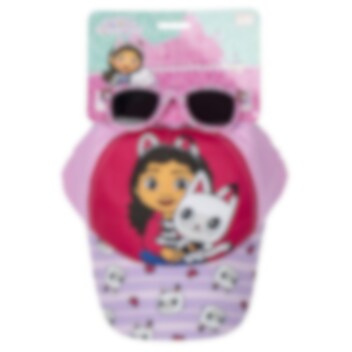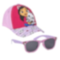 Ein komplettes Set mit einer stilvollen rosa gefärbten Kappe und einem Paar Premium-Sonnenbrillen, beide in Kindergröße. Auf den Brillen sind Motive aus der Gabby's Dollhouse Serie.
